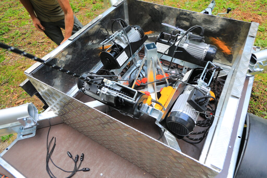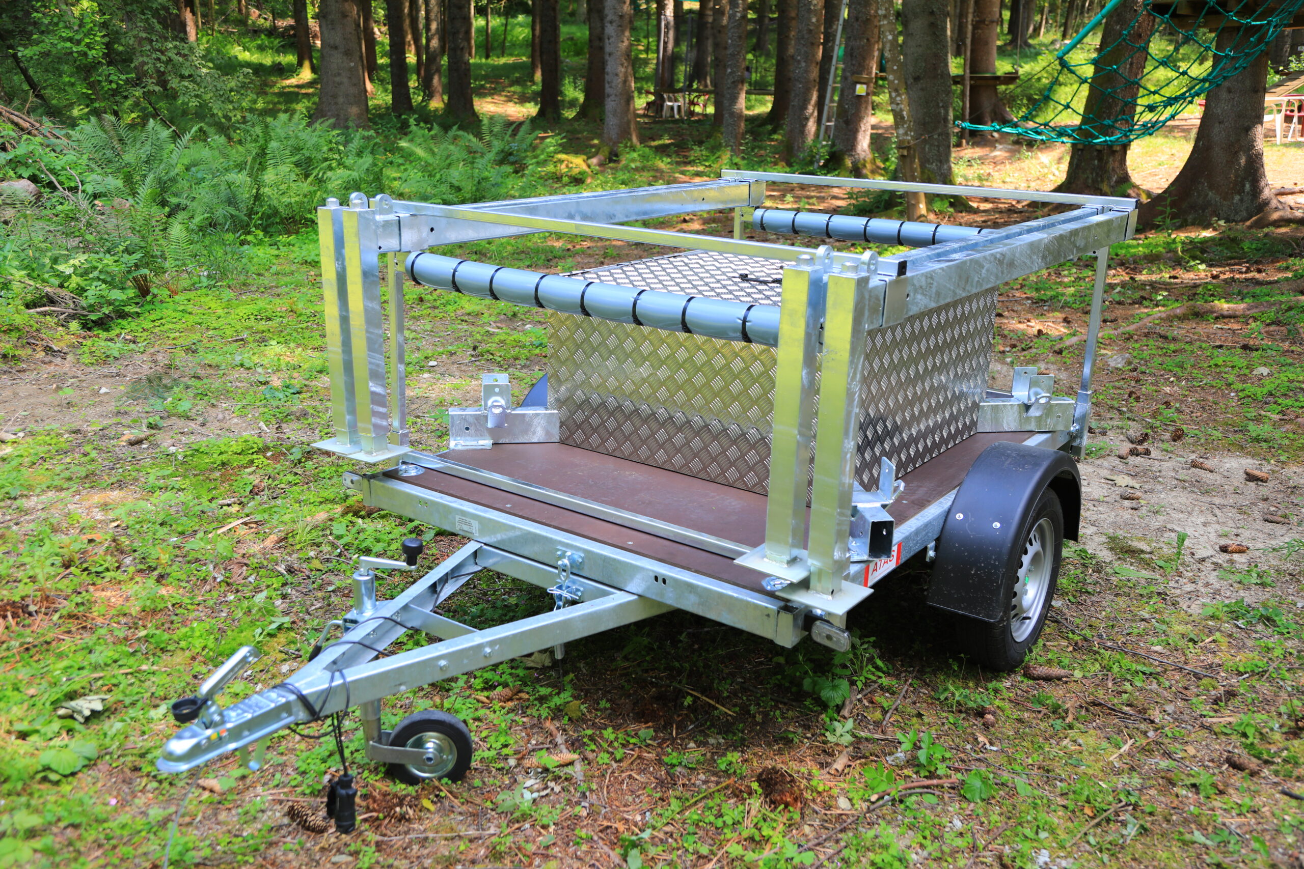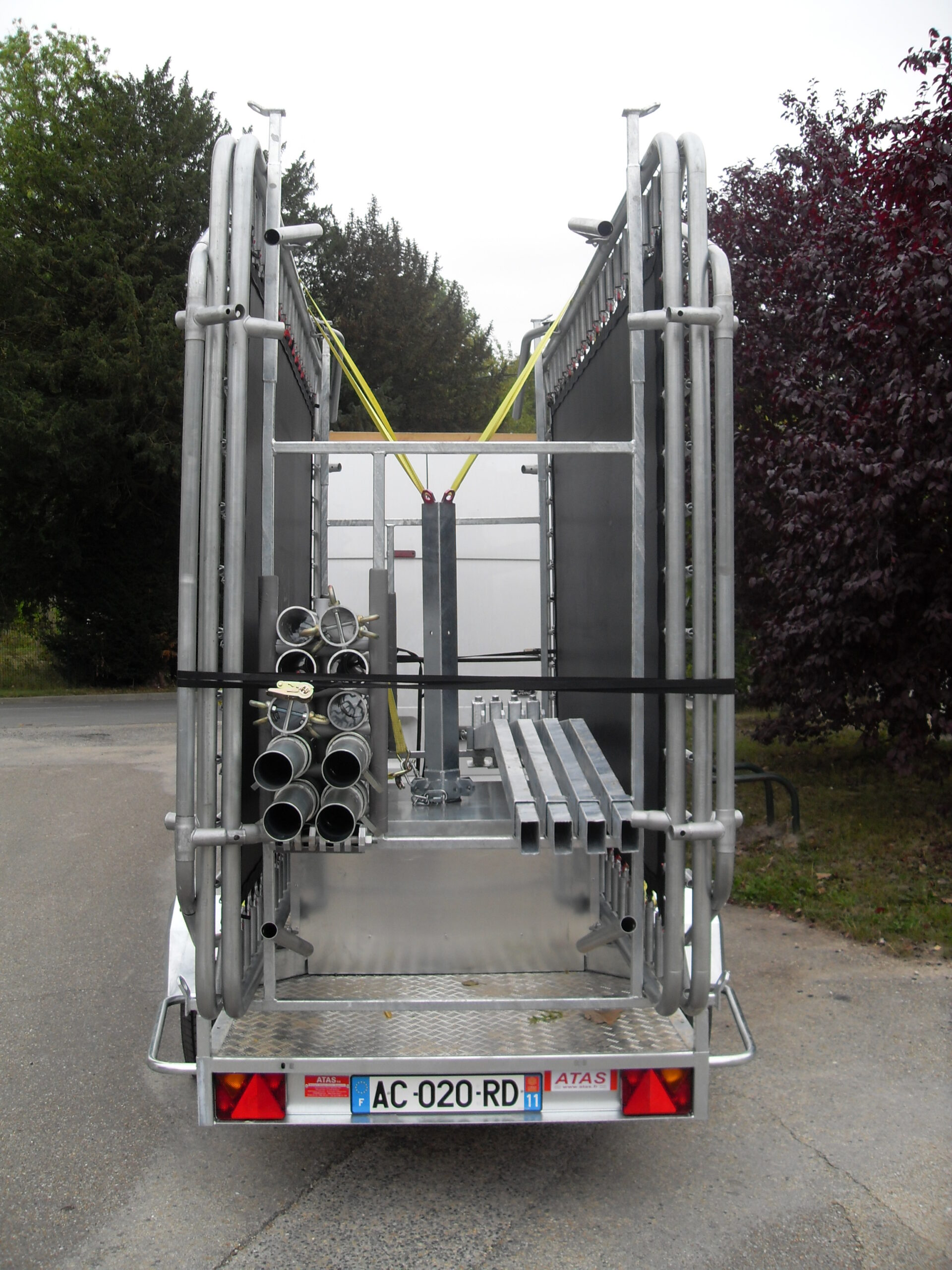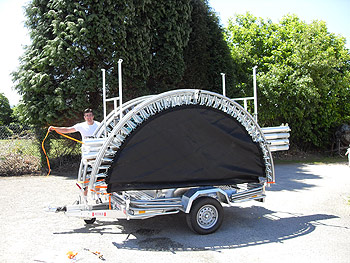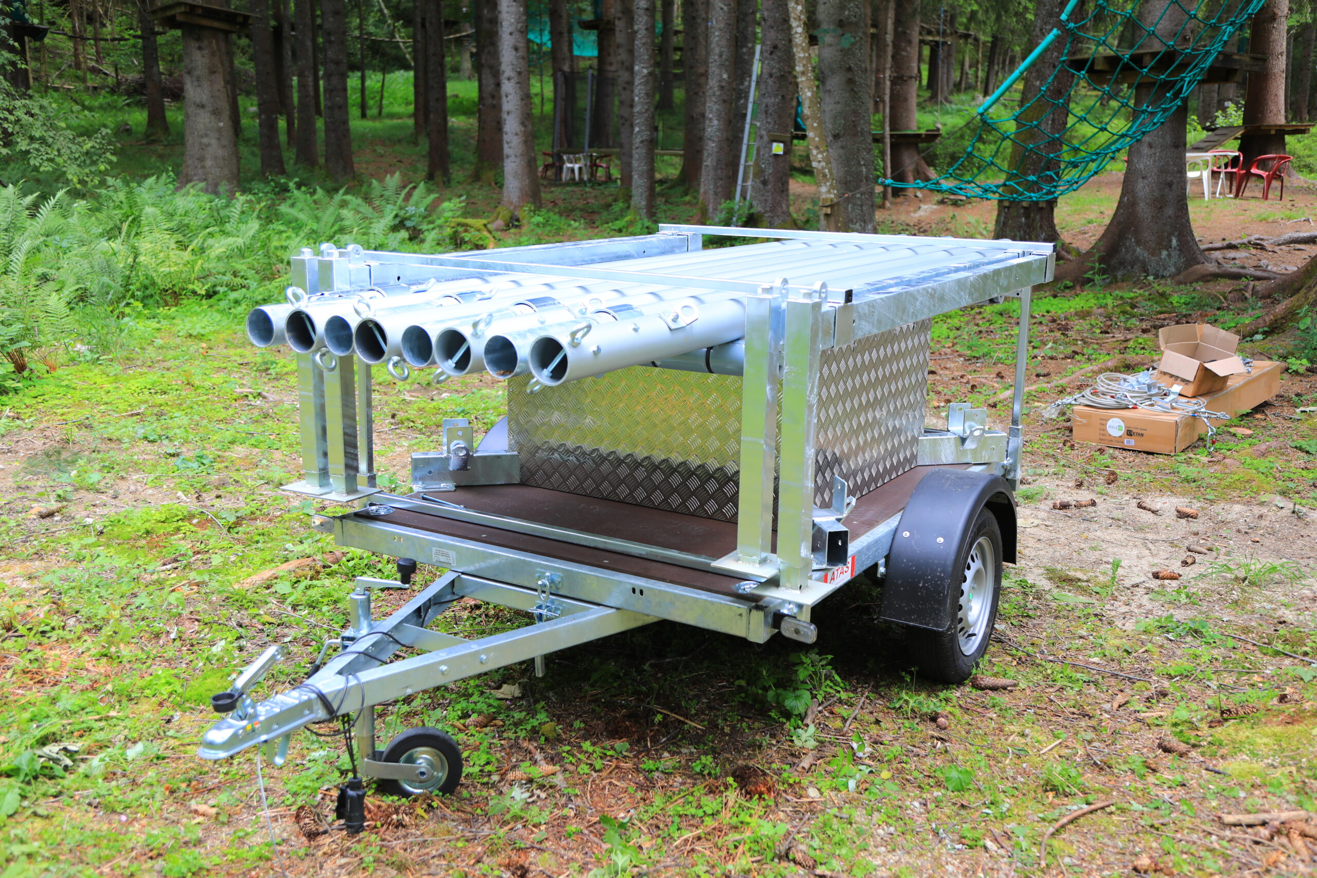 Replié, l’ensemble de la structure et son accastillage prennent place sur la remorque. Seules quelques petites pièces sont contenues dans le coffre du véhicule.