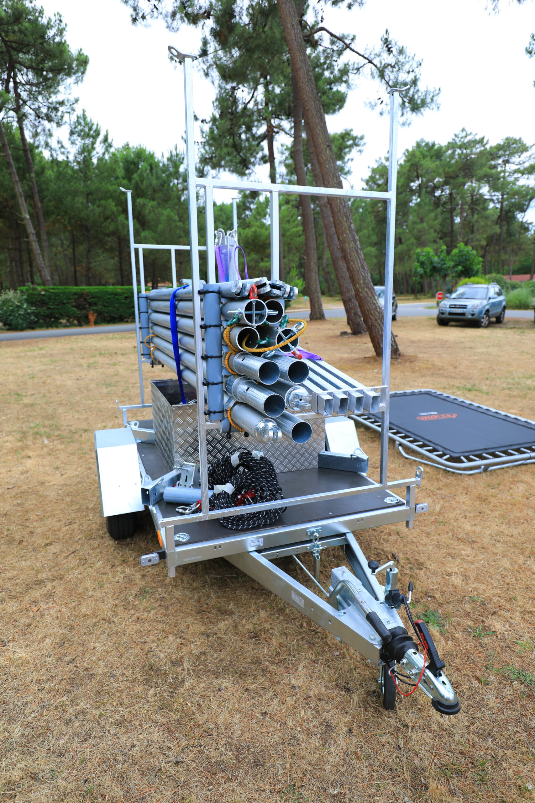 Le Bungy sur remorque est disponible en version de 2 à 6 trampolines, la remorque simple essieux pour des transports de 1300 kg ou double essieux.